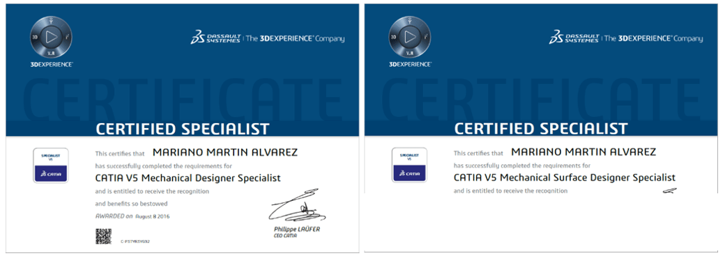 Una vez superados los exámenes de Part Design y Assembly Design se obtendrá, de forma automática la certificación como CATIA Mechanical Designer Specialist. Una vez superados los exámenes de Part Design y Surface Design se obtendrá, de forma automática, la certificación como CATIA Mechanical Surface Designer Specialist. Todo ello, tanto los diplomas provisionales como los definitivos están disponibles para el usuario en la 3DS Certification Center platform.