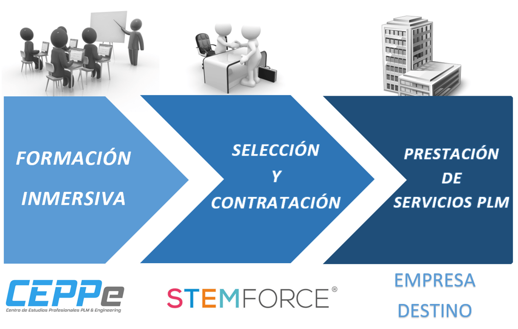 PLM Experience es un programa de formación/inmersión en el ámbito de la implantación de sistemas PLM destinado a una serie de candidatos seleccionados para las empresas adheridas. Estas personas, una vez formadas de forma robusta en CEPPe (Centro de estudios profesionales PLM & Engineering), podrán desempeñar la función de Consultor PLM y estarán capacitadas para desarrollar, en las empresas destino, las siguientes actividades: